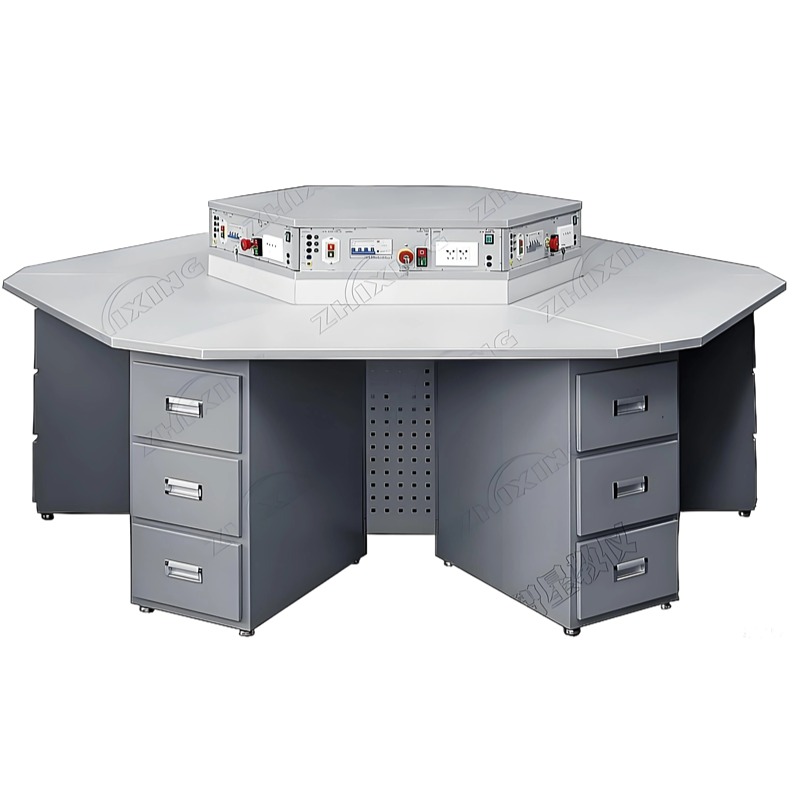 智星教仪AZ-503 钳工技能实训台根据相关国家职业标准的相关考核要求,完成以钳工的各项技能实训。六角形回转式面设计:桌体结构稳固、特殊处理的台面、抗冲击力强等特性,且多重材质台面的选择,台面**承重可达 1.0T。**空间利用,适合有限的条件下多人协同工作。钳工技能全面性:在任务引领下锻炼学生的划线、錾、锉削、錾削、锯、攻丝、绞孔加工等钳工技能,掌握划线、装配、调试、维修等技能。适合高校工程训练中心、高职院校、职业学校、技工学校机械制造与维修类专业的教学与技能实训,也适合职业培训学校、职教中心、鉴定站/所等相关课程的技能鉴定